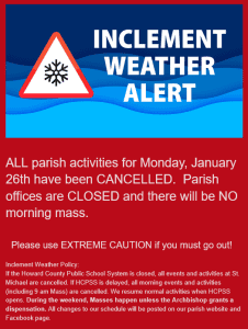 If the Howard County Public School System is closed, all events and activities at St. Michael are cancelled. If HCPSS is delayed, all morning events and activities (including 9 am Mass) are cancelled. We resume normal activities when HCPSS opens. During the weekend, Masses happen unless the Archbishop grants a dispensation. All changes to our schedule will be posted on our parish website and Facebook page.